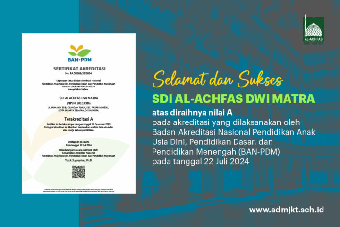 vamtam-theme-circle-post Selamat dan Sukses Atas Akreditasi A SDI Al-Achfas Dwi Matra Jakarta Tahun 2024 September 15, 2024 Jakarta, Admjkt.sch.id - Selamat dan Sukses SDI Al-Achfas Dwi Matra atas diraihnya nilai A pada... READ MORE